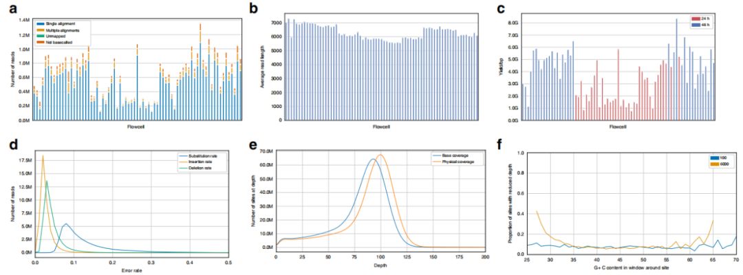 GM12878人B淋巴細胞采用PCR擴增和6kb片段篩選的文庫制備方案,共計獲得45,740,123條reads(圖1a),平均讀取長度為6373bp(圖1b)在流動細胞中是一致的,并且基于測序文庫的物理大小選擇非常接近預期??倲?shù)據(jù)量為273.4Gb,每個flow cell的平均產(chǎn)量為3.7Gb(圖1c)??傆?2,924,782個高質(zhì)量clean reads的比對率為99.3%,唯一比對率為88.8%。