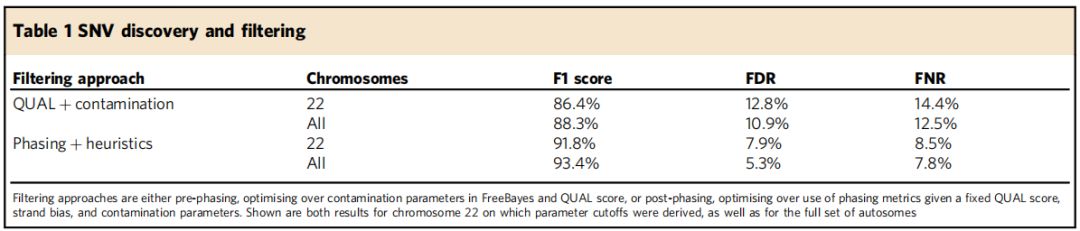使用過濾器改進變異檢測,通過phasing和注釋過濾器(Post?phasing classification)顯著改善變異檢測,*佳結(jié)果F1評分為92.2%,F(xiàn)DR為7.1%,F(xiàn)NR為8.5%(表1,圖2中)。進一步考慮覆蓋深度>=60X的假定變異位點(基因組的85%)時,觀察到F1得分改善至93.6%,F(xiàn)DR為6.1%,F(xiàn)NR為6.6%(圖2右),這意味著減少或消除覆蓋深度偏差源(如PCR)的操作改進在提高z確性方面可以發(fā)揮一定作用。(百邁客目前ONT全基因組重測序和ONT全基因組甲基化測序建庫過程正是PCR-free建庫–direct-DNA建庫,一是可減少覆蓋深度偏好,有利于提高變異檢測z確度;二是可以保留堿基修飾信息,同時檢測甲基化修飾等信息)