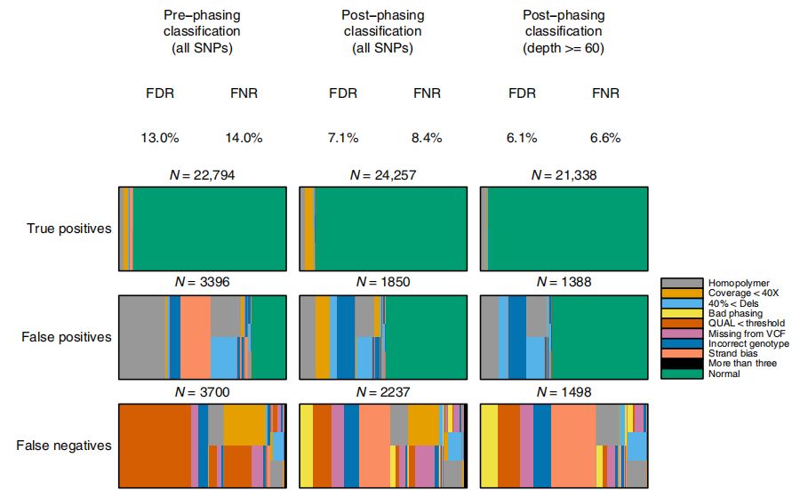 為了更好地理解變異檢測錯誤的潛在來源,作者注釋了變異檢測位點,其中包含一系列關(guān)于參考序列和跨越位點的reads注釋。這些包括接近均聚物重復區(qū)域、較低的覆蓋深度、鏈偏好和存在大量短缺失的reads覆蓋區(qū)域(圖2左)。表明,假陽性(FP)和假陰性的主要驅(qū)動因素是均聚物和低覆蓋率。此外,使用高質(zhì)量評分閾值(QUAL)來維持可接受的FDR會產(chǎn)生許多假陰性。