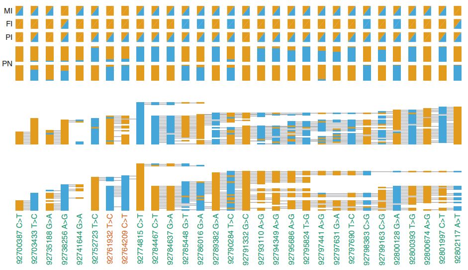 注:前3行為未定相母親(MI),父親(FI),先證者(PI)基因型,第4行為先證者單倍型Phased proband genotypes (PN)。藍色=alt ,橙色=ref。PN下面2行為單倍型1(母系遺傳)或單倍型2(父系遺傳)對應的reads,其中對于每條read,堿基是矩形,reads跨度以水平線顯示。間隙代表gap(缺失)。底部顯示物理位置,感興趣的位點為紅色?;贕RCh37 NM_152703.3, 92761932 T>C對應于c.3353 A>G,92764209 C>T對應于c.1076 G>A。