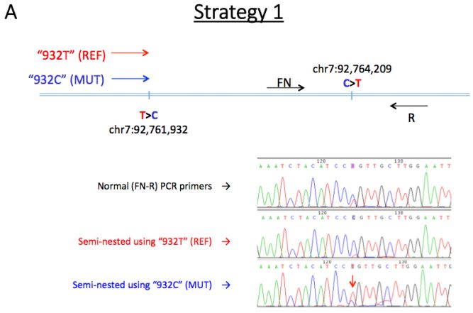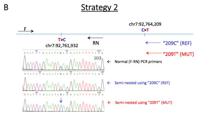 不出所料,ONT數(shù)據(jù)也鑒定到了具有預期雜合基因型的c.1076 G> A和c.3353 A> G變異。使用ONT reads對其他附近變異進行定相,以確認新生變異的遺傳和來源(圖3)。這2個新生突變被定相于一個199kb的block內(nèi),33條reads(6.1-18.9kb)跨越2個新生突變位點,11條reads包含新生突變等位基因,8條reads包含2個參考等位基因,表明突變的等位基因是順式的(來自于同一條染色體)。(NA12878數(shù)據(jù)中沒有reads跨越包含2個位點的突變等位基因。)使用一系列等位基因特異性PCR實驗證實來自O(shè)NT reads的新生等位基因的單倍型構(gòu)象。相位區(qū)中的側(cè)翼位點表明,父系遺傳的單倍型出現(xiàn)了新生變異(圖3)。