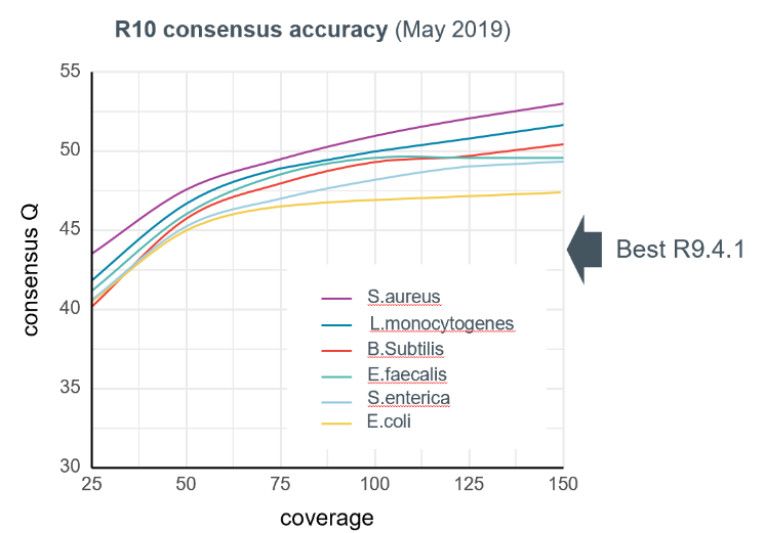 從官方的數(shù)據(jù)顯示,當(dāng)數(shù)據(jù)深度為50X時(shí),R10測序數(shù)據(jù)的consensus序列的準(zhǔn)確性已經(jīng)達(dá)到了Q44,即99.996%以上(圖4)。且隨著測序深度的增加,R10芯片一致準(zhǔn)確性逐漸增加。官方對多物種測試發(fā)現(xiàn),在100X的測序深度下,consensus準(zhǔn)確性可以保持在Q45以上,在有些樣本上甚至已達(dá)到Q50(99.999%)水平(圖4),當(dāng)然加大測序深度也可以想要達(dá)到更高水平,測試結(jié)果中,最高已經(jīng)達(dá)到了Q52(99.9994%)。需要注意的是,這都是未經(jīng)過二代測序數(shù)據(jù)矯正的結(jié)果!