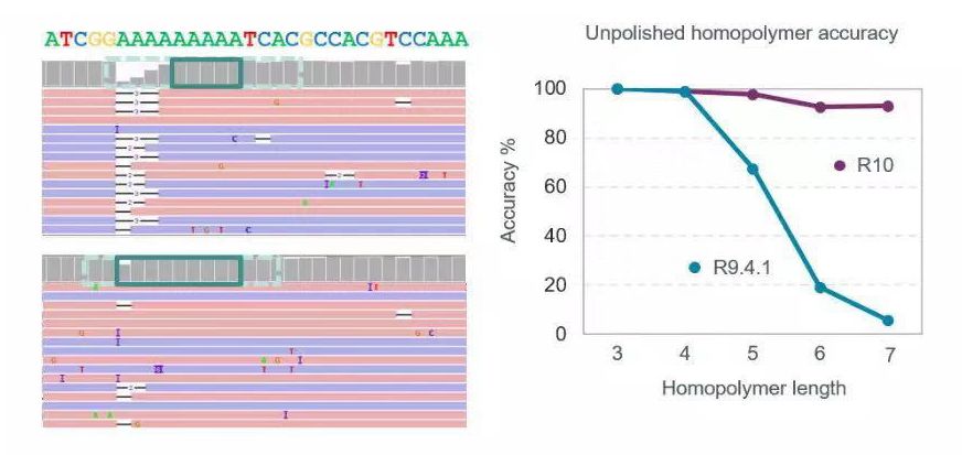 圖5 R10、R9.4.1芯片在同聚物區(qū)域的測序準(zhǔn)確度