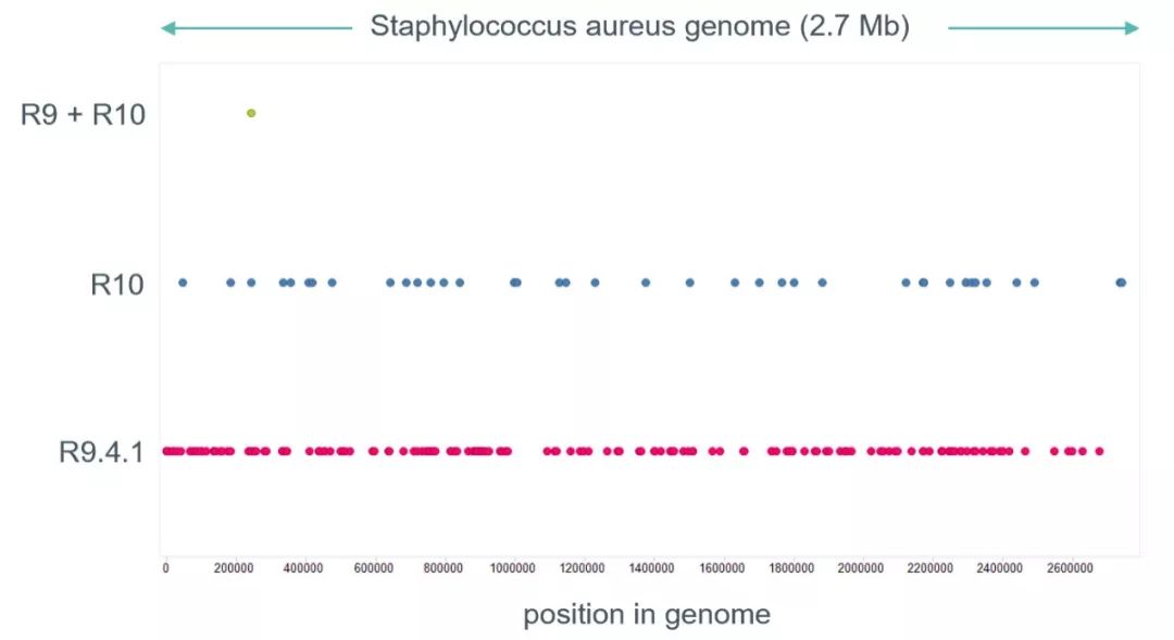 官方通過檢測同一樣本R10和R9.4.1中的錯(cuò)誤在基因組上的情況,發(fā)現(xiàn)R9.4.1與R10的錯(cuò)誤在基因組上分布并不是完全重疊的,通過兩種版本芯片的數(shù)據(jù)進(jìn)行混合分析,可極大地提高序列的準(zhǔn)確性(圖6)。這表明了,在不使用二代數(shù)據(jù)的前提下,后續(xù)也可考慮通過R10和R9.4.1數(shù)據(jù)組合的方式來提高結(jié)果的準(zhǔn)確度!