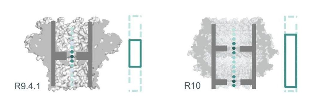 新升級R10芯片大的更新是納米孔采用了雙讀取器(Reader)的設(shè)計(jì),能夠?qū)ν粔A基進(jìn)行兩次信號識別。理論上,同一堿基的識別次數(shù)為R9.4.1版本芯片2倍,由此來增加堿基的判斷率,減小隨機(jī)錯(cuò)誤,并提高一致準(zhǔn)確性。R10與R9.4.1測序方式比較如圖1