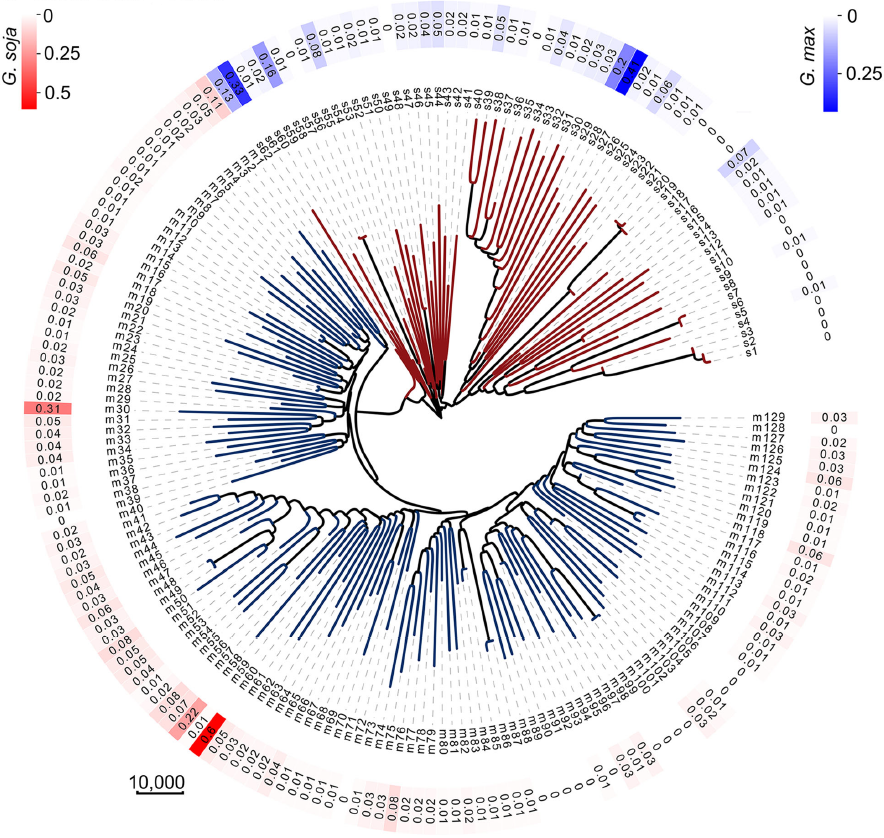 根據(jù)基因序列分析,PI 578357和黑河小黃豆之間及PI 339734和PI 407275之間的分歧時間分別可追溯到約0.37和27萬年前(mya)。由于大豆的馴化發(fā)生在大約6000-9000年前,兩對(野生大豆-栽培大豆)品種之間所檢查的滲入?yún)^(qū)域的如此高的相似性應(yīng)被視為野生大豆-栽培大豆?jié)B入的直接證據(jù)。