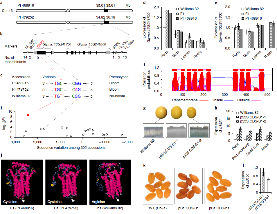 隨后對(duì)RIL的兩個(gè)子集進(jìn)行處理,以通過(guò)測(cè)序(GBS)進(jìn)行基因分型?;蛐秃捅硇蛿?shù)據(jù)的組合在PI 468916和PI 479752中在13號(hào)染色體上種皮開(kāi)花的基礎(chǔ)上定義了一個(gè)區(qū)域(圖2a),該區(qū)域與先前映射的B1區(qū)域重疊,表明這兩個(gè)種質(zhì)由B1基因座控制。在映射區(qū)域內(nèi)的其他標(biāo)記用于鑒定兩個(gè)RIL群體中與B1基因座之間的重組體,最后根據(jù)大豆參考基因組序列將B1基因座精細(xì)映射到一個(gè)包含兩個(gè)基因(Glyma.13G241700、Glyma.13G241800)的14.5 kb區(qū)域(圖2b)。對(duì)三個(gè)親本系的兩個(gè)基因進(jìn)行測(cè)序,Williams 82和兩個(gè)大豆親本之間的差異只有一個(gè)SNP位點(diǎn),即Glyma13G241700的編碼序列(CDS)中的一個(gè)(C到T)點(diǎn)突變,導(dǎo)致氨基酸從半胱氨酸變?yōu)榫彼幔▓D2c)。花后5周,Glyma.13G241700在發(fā)育中的豆莢中最高表達(dá),其在PI 468916和(Williams 82×PI 468916)F1中的表達(dá)水平相似,但均明顯高于Williams 82(圖2d)。相比之下,兩個(gè)親本中的Glyma.13G241800和F1的表達(dá)水平?jīng)]有顯著差異(圖2e)。這些觀察結(jié)果表明,雙親中的Glyma.13G241700最有可能成為B1的候選基因,預(yù)計(jì)B1編碼跨膜轉(zhuǎn)運(yùn)蛋白樣蛋白(圖2f)。