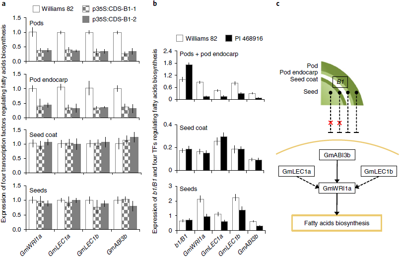 為了闡明B1介導(dǎo)降低種子油含量的機(jī)制,分析了Williams 82發(fā)育豆莢、豆莢內(nèi)果皮、種皮和種子中四種轉(zhuǎn)錄因子GmWRI1a,GmLEC1a,GmLEC1b和GmABI3b的表達(dá)水平。B1和PI 468916的T1轉(zhuǎn)基因植物在R5階段過(guò)表達(dá)。這些轉(zhuǎn)錄因子上調(diào)了大豆種子中脂肪酸的生物合成,其表達(dá)水平與種子油含量呈正相關(guān)。在B1的過(guò)表達(dá)下發(fā)育中的豆莢和豆莢果皮中四種轉(zhuǎn)錄因子的表達(dá)水平均顯著降低而在發(fā)育中的種皮和種子中未觀察(圖4a)。Williams 82和PI 468916之間的B1 / b1表達(dá)模式與之呼應(yīng)(圖4b)。表明B1基因不影響大豆種子中脂肪酸的合成,是通過(guò)下調(diào)脂肪酸生物合成影響莢果(圖4c)。