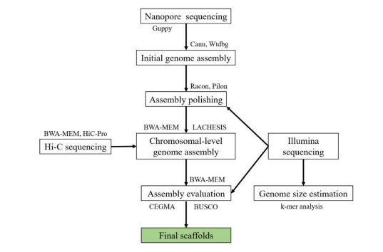 占比地球容量71%的海洋中蘊(yùn)藏著豐富的生物資源,而海洋生物體內(nèi)多糖和蛋白含量較高,以及部分海洋生物極易死亡腐敗從而引起DNA的降解,給高純度、完整的基因組DNA的獲取帶來了極大的困難。而海洋生物通常與陸生動(dòng)植物相比更為復(fù)雜,組裝拼接的難度更大。本次研究使用Nanopore測(cè)序技術(shù)突破了這些瓶頸,完成了海洋魚類超高質(zhì)量的基因組組裝!研究中使用104X Nanopore測(cè)序數(shù)據(jù)進(jìn)行基因組組裝,通過Canu、WTDBG等多款軟件分別進(jìn)行組裝,選取組裝結(jié)果(主要從基因組大小,contig N50,組裝完整性,組裝準(zhǔn)確性等方面評(píng)估)進(jìn)行后續(xù)研究?jī)?yōu)化。研究者最終使用WTDBG軟件組的基因組版本結(jié)合Hi-C技術(shù)的進(jìn)一步優(yōu)化,組裝完成474.31 Mb基因組,并將99.44%的基因組掛載至20條染色體上,?ContigN50提升至22.46 Mb,且最長(zhǎng)的Contig達(dá)到32.32 Mb!