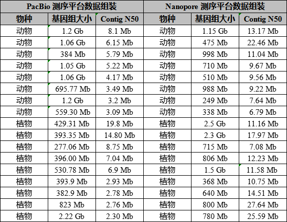 同時通過PacBio和Nanopore雙平臺測序數(shù)據(jù)組裝結(jié)果的比較發(fā)現(xiàn),利用PacBio數(shù)據(jù)進(jìn)行基因組組裝Contig N50一般達(dá)到Mb級別,而利用Nanopore數(shù)據(jù)進(jìn)行基因組組裝,Contig N50指標(biāo)平均水平基本能再提升2倍或者更高,甚至許多物種能達(dá)到幾十Mb(如百邁客利用Nanopore測序平臺組裝的水產(chǎn)動物綠鰭馬面鲀基因組,Contig N50高達(dá)22 Mb)。