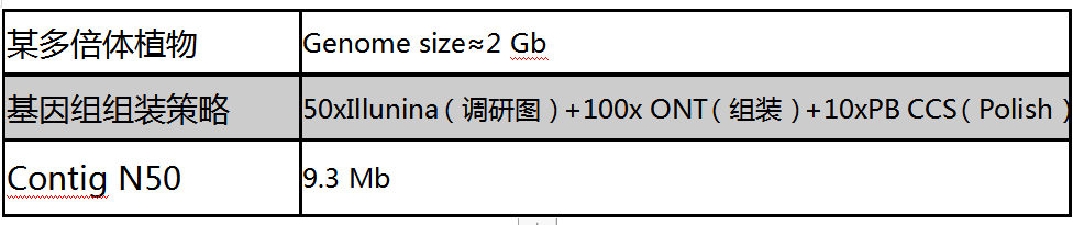 由于Nanopore測序Reads讀長長,PacBio Sequel II HiFi模式測序準(zhǔn)確性高達(dá)99%以上,為了同時利用其雙平臺各自的優(yōu)勢,我們擬通過Nanopore測序數(shù)據(jù)對某多倍體植物進(jìn)行基因組組裝,同時通過低深度PacBio CCS數(shù)據(jù)進(jìn)行Polish,進(jìn)而對該多倍體植物基因組連續(xù)性,完整性及準(zhǔn)確性進(jìn)行評估,以獲得高連續(xù)性,高準(zhǔn)確的基因組密碼信息,測試結(jié)果如下: