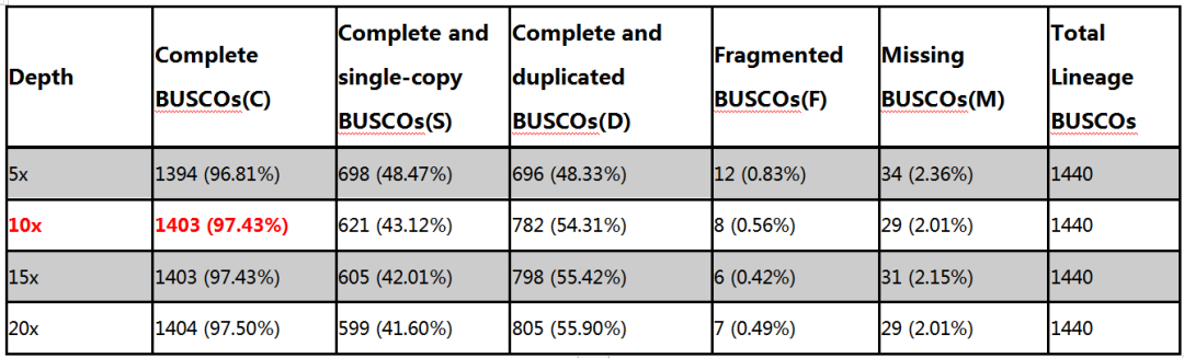 2.?采用不同深度下的PacBio CCS數(shù)據(jù)進(jìn)行Polish,然后利用真核有胚植物數(shù)據(jù)庫對不同深度PB CCS Polish的結(jié)果進(jìn)行BUSCO完整性評估,以獲得最佳的CCS數(shù)據(jù)矯正深度,分析結(jié)果如下: