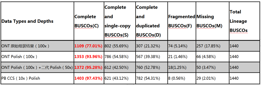 3.?采用不同測序平臺數(shù)據(jù)對Nanopore原始組裝結(jié)果進(jìn)行Polish,進(jìn)而利用真核有胚植物數(shù)據(jù)庫進(jìn)行BUSCO完整性評估,完整性比對結(jié)果如下: