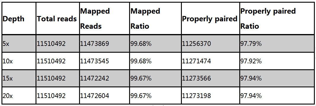 利用5x,10x,15x和20x的PacBio CCS數(shù)據(jù)對基因組進(jìn)行Polish,然后利用50x的二代數(shù)據(jù)回比到基因組上,最后發(fā)現(xiàn)回比率相當(dāng),雙端比對效率97%左右。