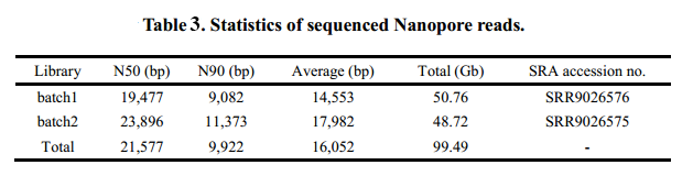 在對同源四倍體紫花苜蓿(Medicago sativa?L.)基因研究中,首先利用了70 GB,~22x PacBio CCS數(shù)據(jù)進(jìn)行基因組組裝,組裝獲得紫花苜蓿基因組大小3154 Mb,Contig N50=459 kb, 然后利用ALLHiC進(jìn)行同源染色體組群的劃分,最后通過Hi-C互作熱圖、遺傳圖譜共線性、ONT數(shù)據(jù)回比、BUSCO完整性、轉(zhuǎn)錄組對基因組完整性等進(jìn)行評估,值得注意的是在ONT數(shù)據(jù)回比評估中(Table 3),文中篩選了99 GB ONT long reads中的最長200條reads(ranged from 95 to 263 Kb)進(jìn)行回比,發(fā)現(xiàn)89%的的reads都能比對到single染色體上,結(jié)合其它評估方法,進(jìn)一步說明了組裝及染色體位置的準(zhǔn)確性。