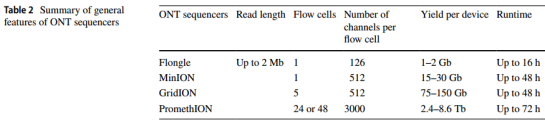 Oxford Nanopore ?Technologies(ONT)創(chuàng)立了單分子納米孔測序,其主要原理是當(dāng)單鏈DNA/RNA分子的核酸堿基蛋白納米孔時(固定在鹽溶液浸沒膜上的蛋白質(zhì)納米孔,固定膜上施加了固定電壓),通過創(chuàng)新的技術(shù)識別離子電流的微小變化,即:當(dāng)DNA分子穿過納米孔時,相對于每個核苷酸,都會獲得不同的電流信號。記錄每個孔的離子電流變化,并基于馬爾可夫模型或遞歸神經(jīng)網(wǎng)絡(luò)的方法將其轉(zhuǎn)換為堿基序列(圖3)。其優(yōu)勢之一是支持RNA直接測序,除此之外,Ultra-long reads (ULRs) 是ONT平臺的另一重要特征,并具有促進(jìn)大型基因組組裝的潛力。Nanopore測序平臺相繼推出MinION,GridION,PromethION及Flongle平臺并投入使用(Table 2)。