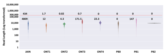 通過雙平臺實(shí)測數(shù)據(jù)的比較分析: Nanopore平臺平均讀長為28.5 Kb左右,Reads N50平均讀長 38Kb左右;PacBio CLR平均讀長20 Kb左右,Reads N50平均讀長 28Kb左右;CCS平均讀長12-15 Kb,Reads N50 16~18Kb,發(fā)現(xiàn)Nanopore比PacBio平臺讀長高10 Kb左右,而PacBio CCS模式讀長遠(yuǎn)低于CLR模式。