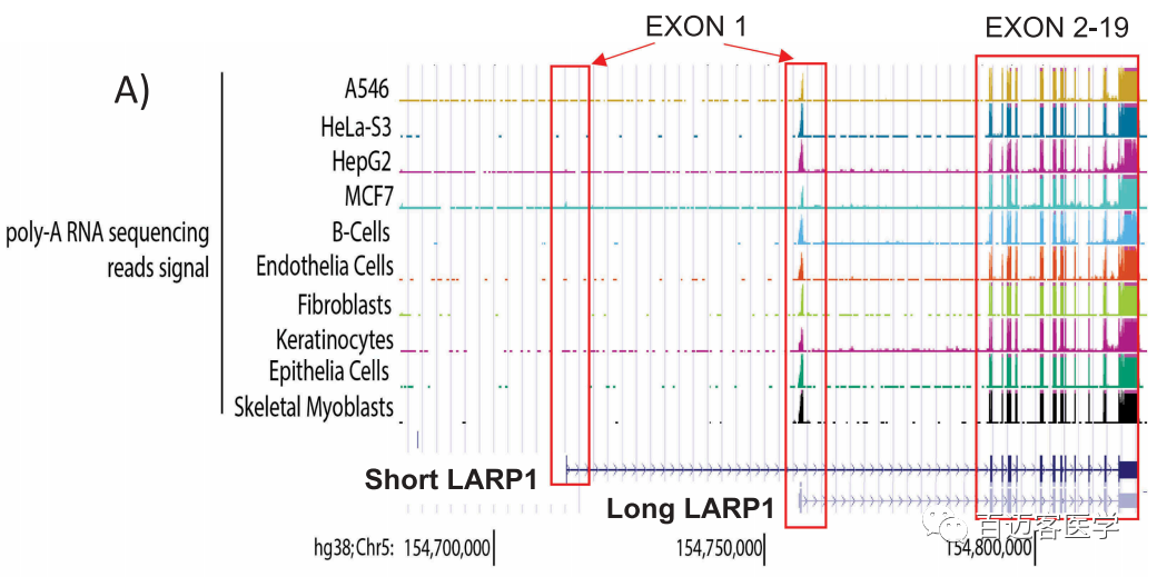 二代短reads polyA轉(zhuǎn)錄組公共數(shù)據(jù)分析:為了研究LARP1在細(xì)胞中的表達譜,作者使用了可公開獲得的RNA測序數(shù)據(jù)集。共計從198個組織、128個細(xì)胞系和54個原代細(xì)胞系中提取了371個包含poly-(A)的RNA測序數(shù)據(jù)集,并將其reads與包含所有預(yù)測的LARP1 isoform的hg38:Chr5 154700000至154850000染色體區(qū)域比對(圖2A)。首先關(guān)注測序reads與第一個外顯子的比對,兩個LARP1亞型不同的區(qū)域。發(fā)現(xiàn)測序數(shù)據(jù)特異比對到長LARP1同工型的外顯子1,沒有reads比對到SI-LARP1的外顯子1。2個isoform間共享的第2-19號外顯子已完全被測序數(shù)據(jù)所覆蓋。