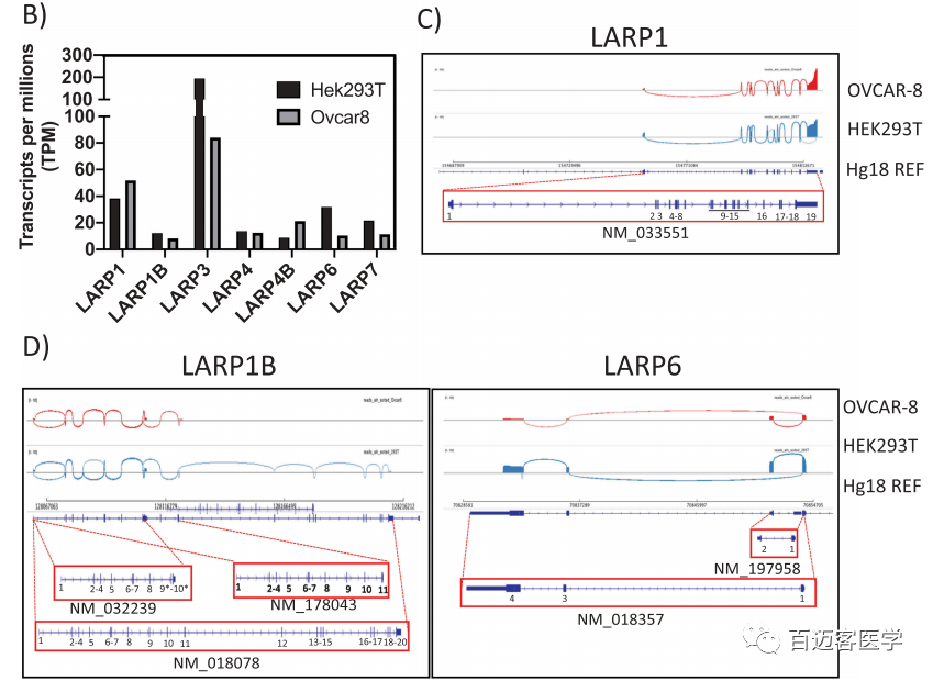 Nanopore全長轉(zhuǎn)錄組測序:為了進一步了解LARP1 isoform的表達,在HEK-293 T和OVCAR-8細(xì)胞(永生化的人類胚胎腎細(xì)胞和卵巢癌細(xì)胞系)中分別進行了牛津納米孔測序技術(shù)(ONT全長轉(zhuǎn)錄組測序)(圖2B-D)。這種RNA直接測序技術(shù)可以檢測長讀長轉(zhuǎn)錄本isoform,并可以無PCR偏倚地定量轉(zhuǎn)錄本豐度。與人類基因組(Hg38)比對,并使用IGV可視化。在HEK-293T細(xì)胞中,檢測到總共2,038,842個轉(zhuǎn)錄本,而在OVCAR-8細(xì)胞的樣品中僅檢測到1,834,870個轉(zhuǎn)錄本。(根據(jù)百邁客的項目經(jīng)驗大概每個樣本2G多的數(shù)據(jù)量)作者對所有比對到7個LARP家族成員的轉(zhuǎn)錄本進行表達定量,校正各樣本數(shù)據(jù)量差異將其標(biāo)準(zhǔn)化為TPM(transcripts per million,每百萬轉(zhuǎn)錄本)(圖2B)。在LARP家族成員中,LARP3的轉(zhuǎn)錄本表達量最高(TPM=194)。相反,其他LARPs的表達值TPM遠(yuǎn)低于50,其中LARP1B和LARP4B的表達最低。且與前人研究一致,致癌性LARP1在OVCAR-8癌細(xì)胞(TPM 52)中的表達水平高于HEK-293 T細(xì)胞(TPM 38)中的表達水平。為了分析LARP1 sioform在這些細(xì)胞中的表達,作者使用Sashima圖(圖2C)可視化剪接位點。使用這種RNA直接測序的nanopore全長轉(zhuǎn)錄組方法,在2個測試的細(xì)胞系中均未檢測到SI-LARP1。盡管LARPs的表達水平低于其他基因,例如GAPDH(在OVCAR-8細(xì)胞中TPM高達6396),因此LI-LARP1被鑒定為主要表達的LARP1亞型。作者還觀察到5′截短的LARP1轉(zhuǎn)錄本積累,LARP1B的3種isoform共表達(NM-018078,NM_178043,NM-032239),LARP6的2種isoform共表達(NM_197958,NM_018357)(圖2D)。對于其他LARP,能夠確認(rèn)ONT測序檢測到的主要轉(zhuǎn)錄本與經(jīng)典isoform相對應(yīng)。