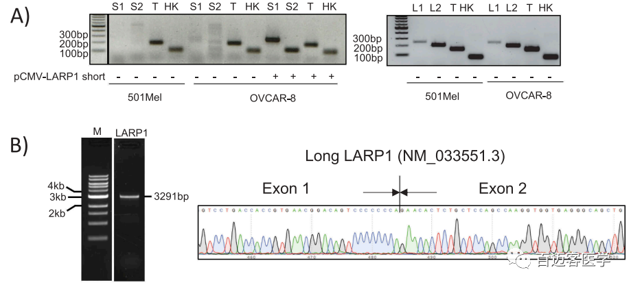 3、特異性引物擴增及sanger測序驗證SI-LARP1和LI-LARP1 isoform表達情況:501-MEL(黑色素瘤細(xì)胞系)和OVCAR-8細(xì)胞中只表達LI-LARP1;