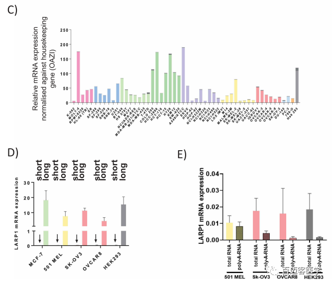 為了確定LI-LARP1是否在更廣泛的癌細(xì)胞系中表達,作者用qRT-PCR檢測了NCI-60癌細(xì)胞系(美國國立癌癥研究(NCI)規(guī)定的60種用于藥物篩選的癌細(xì)胞系,包括黑素瘤、腎癌、卵巢癌、腦癌、白血球增多癥、乳腺癌、非小細(xì)胞肺癌和前列腺癌細(xì)胞系)(圖3C)。盡管樣品之間LI-LARP1的表達差異高達37倍,但在所有細(xì)胞系中均可檢測到。然而,所有系中SI-LARP1表達均低于檢測閾值(cT值<35)。并測量NCI的5種癌細(xì)胞系(MCF-7、OVCAR-8、SK-OV-3、501-MEL和HEK-293T)中的SI和LI-LARP1表達驗證了這些發(fā)現(xiàn)(圖3D)。在所有五個細(xì)胞系中,LI LARP1的水平至少比SI-LARP1高1000倍。由于SI-LARP1的表達水平接近或低于檢測極限,因此作者探討了其余檢測到的轉(zhuǎn)錄本是否為人工產(chǎn)物。成熟的mRNA的標(biāo)志是存在3?poly-(A)尾,這是其核輸出所必需的。從OVCAR-8、SK-OV-3、501-MEL和HEK-293T中提取的總RNA使用隨機或寡聚(dT)引物進行反轉(zhuǎn)錄(圖3E)。隨著隨機引物與RNA庫中任何類型的轉(zhuǎn)錄本退火,PCR擴增還將檢測未加工完成的mRNA種類。相反,寡聚(dT)引物導(dǎo)致多聚腺苷酸化(帶polyA)的mRNA發(fā)生特定的逆轉(zhuǎn)錄。使用基因特異性引物測量2個cDNA文庫中SI-和LI-LARP1 isoform的水平。將表達水平使用管家基因OAZ1標(biāo)準(zhǔn)化,計算相對表達量。作者發(fā)現(xiàn)完全加工和多聚腺苷酸化的SI-LARP1 mRNA的水平低于檢測極限,表明SI-LARP1 mRNA表達但未完全加工成成熟的聚腺苷酸化的mRNA。