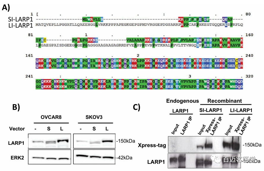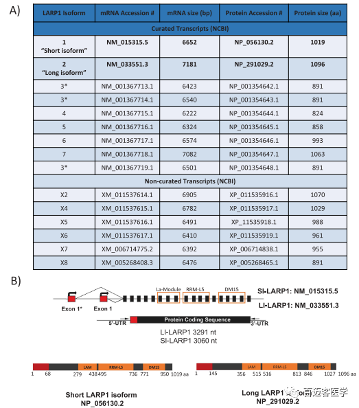 圖1A為NCBI基因數(shù)據(jù)庫中列出的9種不同的LARP1經(jīng)驗證的isoform。LARP1典型轉(zhuǎn)錄本為NM_015315.5,編碼1019個氨基酸(NP_056130.2)的蛋白質(zhì),在此處稱為“ SI-LARP1”。UniProtKB數(shù)據(jù)庫引用了另一個比較長的轉(zhuǎn)錄本NM_033551.3作為LARP1的規(guī)范形式,它對應(yīng)于1096個氨基酸蛋白(NP_291029.2),在此稱為“LI-LARP1” 。SI-LARP1蛋白與LI-LARP1不同,它缺少前77個氨基酸,并且氨基酸M1至N67不同。