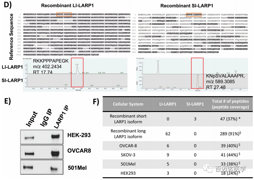 為了驗證這一點,首先,在OVCAR-8細(xì)胞中異位表達了2種LARP1 isoform,并使用針對共表達的Xpress標(biāo)簽的抗體從粗蛋白裂解物中免疫沉淀富集LARP1蛋白(圖4C)–pull down實驗。隨后,使用胰蛋白酶或胰凝乳蛋白酶對樣品進行溶液消化后,Shotgun LC MS/MS質(zhì)譜分析以鑒定對應(yīng)于SI-或LI-LARP1 isoform的N端特異性肽段。鑒定了從序列位置45和46產(chǎn)生的3種肽(質(zhì)量為N46SVALAAAPR:485.2773 Th(m/z); K45NpSVALAAAPR:549.3257 Th(m/z); K45NSAVALAAAPR:589,3085 Th(m/z ))作為SI-LARP1的唯一特征(圖4D)。相反,對于LI-LARP1,鑒定了由與外顯子1對應(yīng)的蛋白質(zhì)序列產(chǎn)生的152個肽。第二步,免疫沉淀富集OVCAR-8、501-MEL、SK-OV-3和HEK-293T細(xì)胞的內(nèi)源LARP1,并進行質(zhì)譜分析,使用監(jiān)督自動算法檢測預(yù)先指定的isofrom特異性肽(圖4E-F)。LARP1的肽覆蓋率范圍為內(nèi)源性免疫沉淀蛋白的24-44%。盡管在所有4個細(xì)胞系中都鑒定出了與LI-LARP1 N端相對應(yīng)的獨特肽,但我們無法在任何樣品中鑒定出對SI-LARP1亞型具有特異性的任何肽。這些結(jié)果與觀察到的不存在對應(yīng)于SI-LARP1的mRNA相一致。
