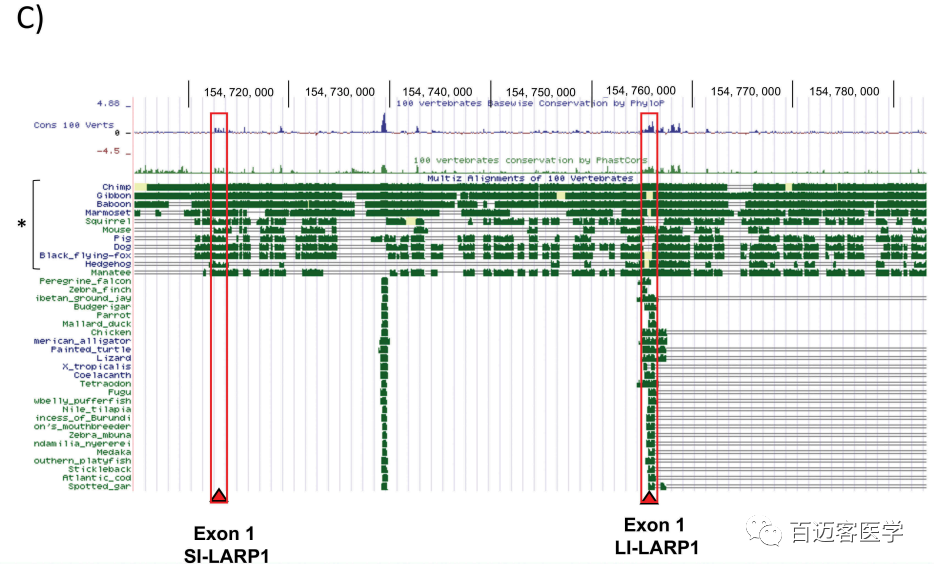 接下來,作者對SI-LARP1是否可以發(fā)揮獨特的功能作用感興趣。為此分析了2種LARP1亞型的TSS區(qū)保守水平(圖5C)。作者假設(shè),進化保守將暗示選擇性壓力,因此每種亞型的作用不同。為了解釋LARP1亞型的進化保守性,使用UCSC基因組瀏覽器在脊椎動物(鳥類、魚類、兩棲動物、爬行動物、哺乳動物)亞門上生成了100個可用LARP1序列的多序列比對。出乎意料的是,LI-LARP1外顯子1在整個亞科中都具有很強的保守性,但SI-LARP1外顯子1的保守性僅存在于胎盤動物分支中,其中包括人類和其他靈長類動物。這表明它可能在胎盤哺乳動物的進化晚期獲得了功能性作用。相比之下,LI-LARP1的保守性跨多個進化分支表明作用更為古老。