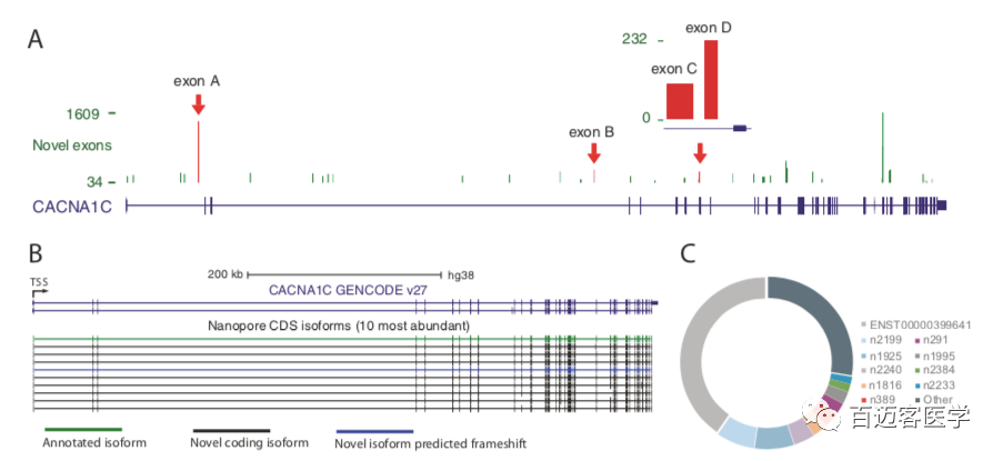 在CACNA1C基因座內(nèi)總共注釋了39個(gè)潛在的新外顯子,其中38個(gè)在至少2個(gè)人或組織中被識(shí)別,并在每個(gè)文庫(kù)中得到至少5條nanopore reads的支持(圖2A)。通過(guò)PCR和Sanger測(cè)序確認(rèn)了新的外顯子與其周?chē)淖⑨屚怙@子之間的剪接連接,從而驗(yàn)證了四個(gè)新的外顯子。這種新的外顯子的成功驗(yàn)證提供了很高的可信度,即通過(guò)納米孔測(cè)序鑒定的新的外顯子是真實(shí)的,并且被整合到CACNA1C轉(zhuǎn)錄本中。表達(dá)量最高的10條轉(zhuǎn)錄本中,有9條是新的且其中有8條被預(yù)測(cè)保持CACNA1C閱讀框架,這表明這些最豐富的新轉(zhuǎn)錄本中有一些編碼功能不同的蛋白質(zhì)異構(gòu)體(圖2B,C)。這些結(jié)果表明,新的CACNA1C轉(zhuǎn)錄本表達(dá)豐富,數(shù)量也很多,目前的注釋缺少許多最豐富的CACNA1C轉(zhuǎn)錄本。