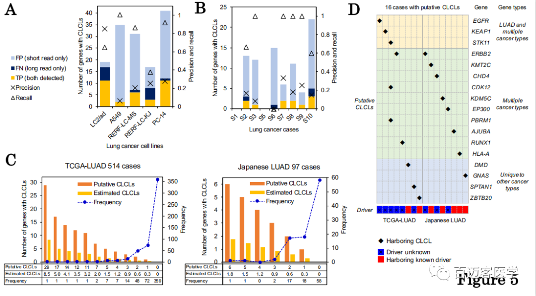 盡管對于所有細胞系和臨床樣品,使用短讀長數(shù)據(jù)分別估計21%和72%的CLCL檢測z確度和重復(fù)檢出率,但將構(gòu)建的分析流程應(yīng)用于514個 TCGA肺腺癌(TCGA-LUAD)和97個日本肺腺癌(Japanese LUAD)樣本全外顯子組測序數(shù)據(jù),通過分別從TCGA-LUAD和日本LUAD病例中進行軟切割reads分析,共檢測到269個和50個具有串聯(lián)重復(fù)結(jié)構(gòu)的連接點,這些結(jié)構(gòu)可能對應(yīng)于CLCL(每個病例1至29個基因)。總計從155(30%)TCGA-LUAD和39(40%)日本LUAD病例中提取了候選CLCL(圖5C)。
