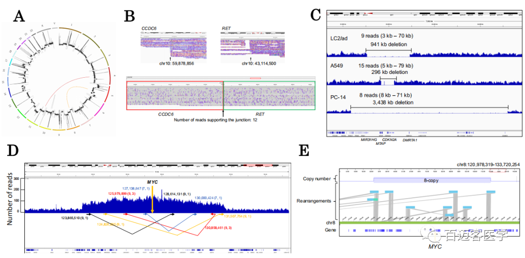 使用長讀長測序數(shù)據(jù),嘗試檢測比點突變大的結(jié)構(gòu)畸變(圖2A)。從LC2/ad的MinION/PromethION數(shù)據(jù)集中,成功鑒定出12條reads與CCDC6-RET融合基因的junction位點直接重疊,這是該細胞系已知的“癌癥驅(qū)動突變”(圖2B)。進一步嘗試鑒定大的缺失,前人報道抑癌基因CDKN2A基因周圍有大的缺失,發(fā)生在LC2/ad,A549和PC-14細胞中。使用這項研究中的MinION/PromethION數(shù)據(jù)集,我們再次確認了該基因在各細胞中的缺失(圖2C)。此外,每個CDKN2A缺失的√確連接點在細胞類型之間是不同的。