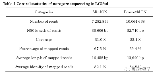 使用納米孔測序儀MinION及其更高通量PromethION平臺進行了長讀長全基因組測序分析。首先通過對LC2/ad的基因組進行測序來驗證新型PromethION儀器的性能,LC2/ad是源自日本肺腺癌患者的肺癌細胞系。作為參考,作者從總共33個MinION runs(R9.5)中收集了全基因組測序數(shù)據(jù),以31×的總測序深度覆蓋了整個人類基因組,共有7,282,846條reads(93,813,338,154 base)。reads的*大長度和N50長度分別為2,495,160 bp和30,606 bp。采用Minimap2將67.5%的reads比對到人類參考基因組UCSC hg38。比對上的reads平均長度為16,452 bp,總體序列一致性平均為82%,比以前的長讀長人類癌癥基因組測序分析顯著增長。PromethION測序需要大約三個flowcells才能產(chǎn)生總共10,064,668個reads(100,440,433,160 bp),總覆蓋率為33x,Reads的*大長度和N50長度分別為987,834 bp和32,710 bp。使用Minimap2,將69.4%的讀數(shù)定位到參考基因組。比對上的reads平均長度為13,620 bp,平均一致性為84.8%。值得注意的是,對于31X 93G數(shù)據(jù)量,PromethION平臺不需要制備多個文庫33次測序,因此與MinION相比,PromethION所需的起始DNA總量可減少十倍以上。