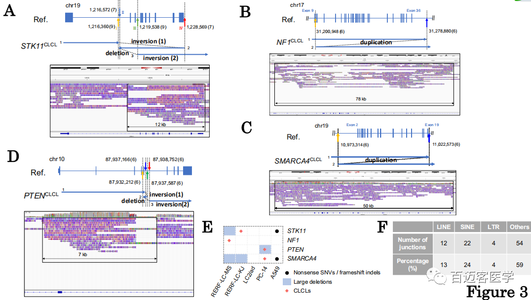 在其他細胞系中也成功鑒定出以下數(shù)量的CLCL:LC2/ad中有16個,A549中有1個,RERF-LC-KJ中有7個,RELF-LC-MS中有7個,PC-14中有11個。重要的是,CLCLs甚至出現(xiàn)在關(guān)鍵的癌癥基因中,例如STK11,NF1,SMARCA4和PTEN基因。異常的結(jié)構(gòu)各不相同,并且由于其復(fù)雜的結(jié)構(gòu)和受累區(qū)域的大小,傳統(tǒng)的基于短讀長測序分析的方法不易檢測到它們中的大多數(shù)。相對簡單的一種是在RERF-LC-MS細胞的NF1基因中檢測到的(圖3B),內(nèi)含子9(chr17:31,200,948)和最后一個外顯子36的下游區(qū)域(chr17:31,278,880;在交界處有6條reads支持)之間的串聯(lián)串聯(lián)重復(fù)。在另一種情況下,SMARCA4 CLCL的結(jié)構(gòu)顯示出從內(nèi)含子1(chr19:10,973,314)到內(nèi)含子20(chr19:11,022,573;在交界處有8條reads支持;圖3C)。在PC-14中的PTEN結(jié)構(gòu)中發(fā)現(xiàn)了更復(fù)雜的情況,該CLCL是倒位和缺失的組合(圖3D)。在這些相對簡單的情況下,將Illumina短reads重新映射到已發(fā)現(xiàn)的junction位點可驗證重建結(jié)構(gòu)的√確識別。