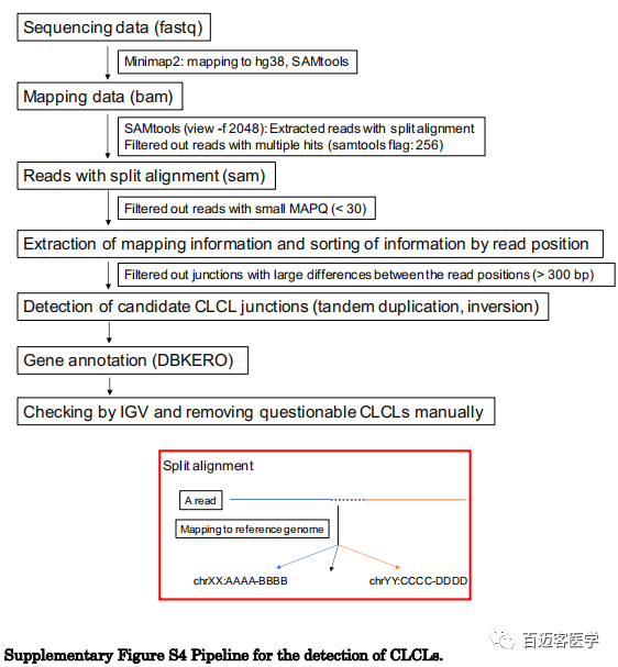 為了更普遍地識別所有肺癌細胞系其他基因座中的CLCL,作者構(gòu)建了一條新的分析性生物信息學(xué)流程。簡而言之,利用了來自比對結(jié)果的split比對信息,根據(jù)reads位置對比對信息進行排序,并提取了候選CLCL。相關(guān)的reads被重組以重建其結(jié)構(gòu)。
