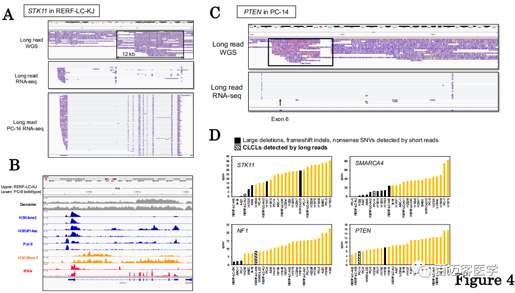 在很多細胞類型的許多關(guān)鍵基因中發(fā)現(xiàn)了新的CLCL型畸變后,立即提出的問題是它們以何種方式產(chǎn)生轉(zhuǎn)錄或表觀基因組后果。全長轉(zhuǎn)錄組測序-使用MinION重新生成并分析了全長cDNA測序數(shù)據(jù)。并利用了以前的Illumina短讀長RNA-seq和ChIP-seq數(shù)據(jù)。在RERF-LC-KJ細胞中,短讀長序列數(shù)據(jù)表明STK11轉(zhuǎn)錄物在內(nèi)含子1處異常剪接,并且轉(zhuǎn)錄躍遷到CLCL結(jié)構(gòu)之前。代表全長轉(zhuǎn)錄本的MinION reads進一步指明√確的剪接模式和轉(zhuǎn)錄終止位點(圖4A)。對于幾乎所有的轉(zhuǎn)錄本,第一次剪接均發(fā)生在異常位置(來自chr19:1,216,268),并且轉(zhuǎn)錄根據(jù)CLCL結(jié)構(gòu)發(fā)生(RNA-seq reads涵蓋從chr19:1,216,572至chr19:1,228,569的斷點II-IV)。在下游CLCL區(qū)域內(nèi)也觀察到一些異常轉(zhuǎn)錄(中間圖,圖4A)。在STK11基因是野生型的PC-14細胞中未觀察到這種異常轉(zhuǎn)錄模式(下圖,圖4A)。