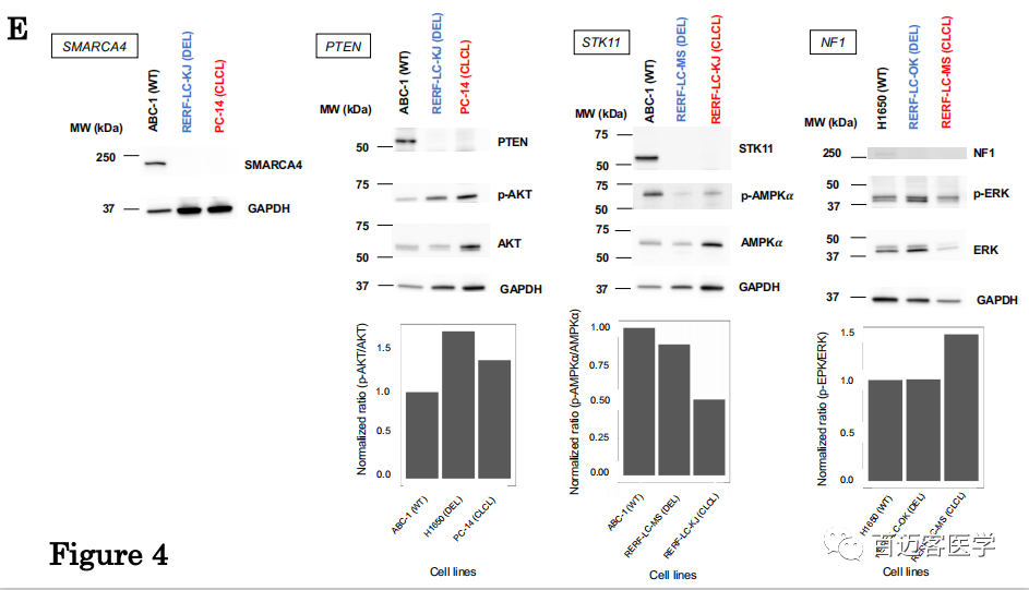 為了解決CLCL的生物學(xué)意義,作者研究了受CLCL影響的基因座如何引起蛋白質(zhì)表達水平及其相關(guān)信號通路變化。蛋白質(zhì)印跡WB分析發(fā)現(xiàn)STK11,NF1,SMARCA4和PTEN的蛋白質(zhì)在這些基因中帶有CLCL的細胞中完全丟失了(圖4E)。進一步檢查了下游蛋白的激活狀態(tài),在所有檢查的case中均觀察到了預(yù)期的信號通路破壞。磷酸化的AKT(phospho-AKT)相應(yīng)地激活mTOR信號通路,而PTEN抑制AKT的磷酸化。觀察到phospho-AKT異常上調(diào),反映了PC-14細胞(PTEN-CLCL)中PTEN的功能喪失。AMPK是在維持細胞動態(tài)平衡中起重要作用的基因,AMPK蛋白在其α亞基處的磷酸化被STK11激活。在RERF-LC-KJ細胞(STK11-CLCL)中,其激活受到損害。NF1基因是RAS的負調(diào)控因子,位于RAS信號通路下游的磷酸化ERK在RERF-LC-MS細胞(NF1-CLCL)中異常上調(diào)。無論是由于常規(guī)畸變還是CLCL,相應(yīng)基因的蛋白質(zhì)明顯丟失,但其后果仍會根據(jù)情況而有所不同。例如,即使STK11蛋白在RERF-LC-MS細胞(STK11缺失)和RERF-LC-KJ細胞(STK11-CLCL)中類似地消失,在RERF-LC-KJ細胞(STK11-CLCL)中磷酸-AMPKα的增強比例也更高。RERF-LC-OK(NF1-缺失)細胞系中NF1蛋白影響幾乎無法檢測到,而對RERF-LC-MS細胞(NF1-CLCL)的影響卻很明顯。表明,其他途徑有時可以彌補關(guān)鍵蛋白的缺失。