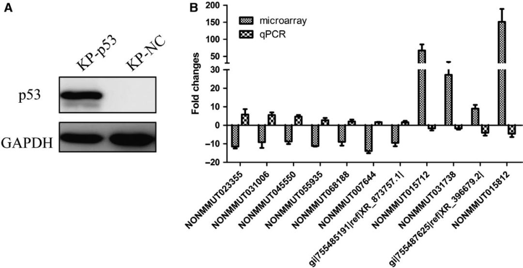 p53是臨床肺癌中最常見的突變抑癌基因,在我們的肺腺癌小鼠模型和KP細胞中均被誘導完全敲除。因此,作者探索了所選擇的210個保守的lncRNAs的非調(diào)控表達是否與p53的缺失有關。攜帶p53基因的慢病毒顆??稍贙P細胞中重新表達p53。如下圖A所示,p53在穩(wěn)定感染的KP細胞中有效地重新表達。qPCR結果顯示,p53再表達顯著改變了11個lncRNAs的表達(FC≥1.5),且差異倍數(shù)與上述p53缺失的肺腺癌組織芯片數(shù)據(jù)相反(圖B),表明p53的再表達對LncRNAs的表達有顯著影響。