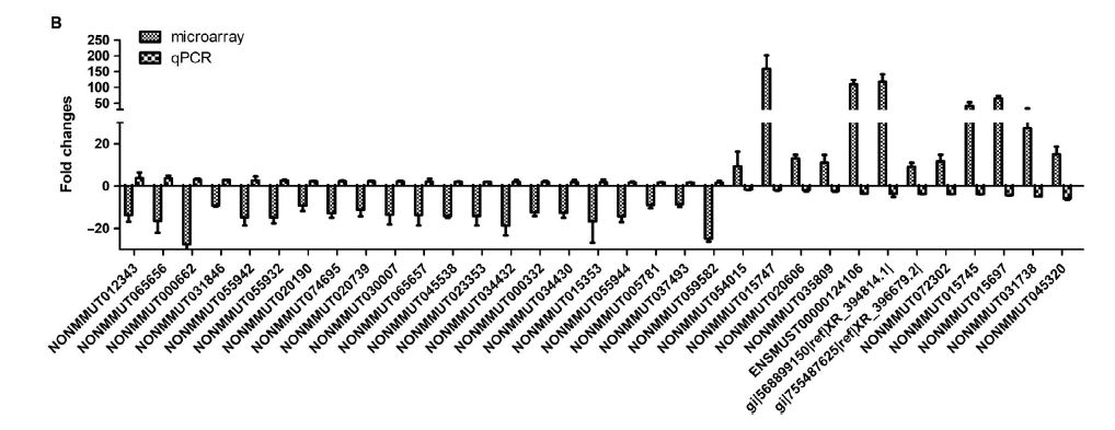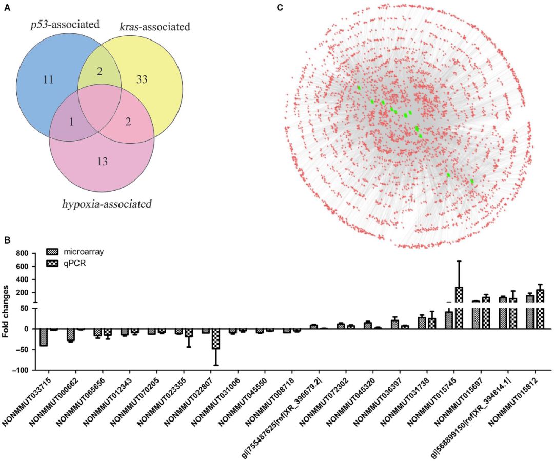 在已鑒定的lncRNAs中,NONMMUT015812非常有趣。(a)其在小鼠肺腺癌組織中的表達增加約150-187倍。(b)其表達與p53呈負相關。(c) NONMMUT015812基因位于反轉錄轉座子樣蛋白1基因和甲狀腺素5-脫碘酶基因之間的染色體上,其中包含幾個在人和小鼠中表達差異的lncRNAs。