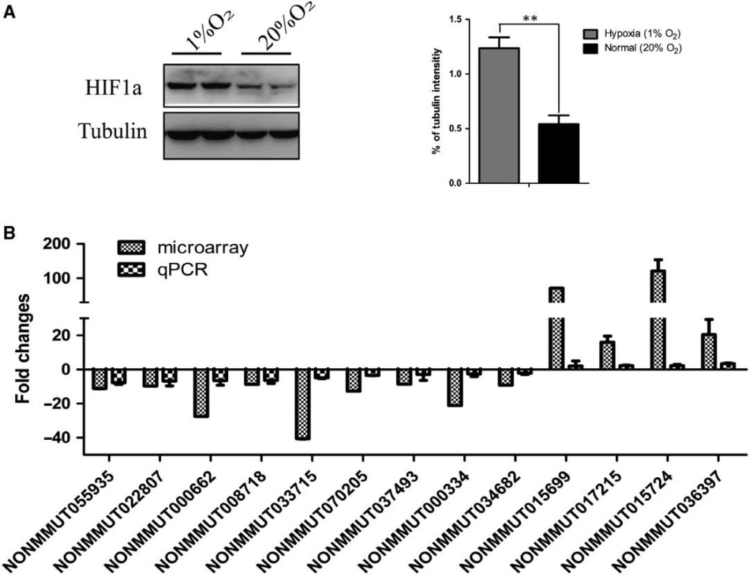 缺氧是實體腫瘤的一個顯著特征,低氧腫瘤通常對傳統(tǒng)的癌癥治療有抵抗力,且腫瘤低氧與晚期惡性腫瘤和轉移相關。作者進一步研究了低氧調(diào)節(jié)的潛在的lncRNAs。將KP細胞在常氧(20% O2)和缺氧(1% O2)中培養(yǎng)48h,WB結果顯示缺氧可有效上調(diào)KP細胞HIF1α的表達(圖A)。RT-PCR結果顯示,缺氧誘導的KP細胞中有13個lncRNAs表達下調(diào),4個lncRNAs在缺氧誘導下表達上調(diào),其表達變化方向與小鼠肺腺癌組織芯片中的表達變化方向一致(圖B)。