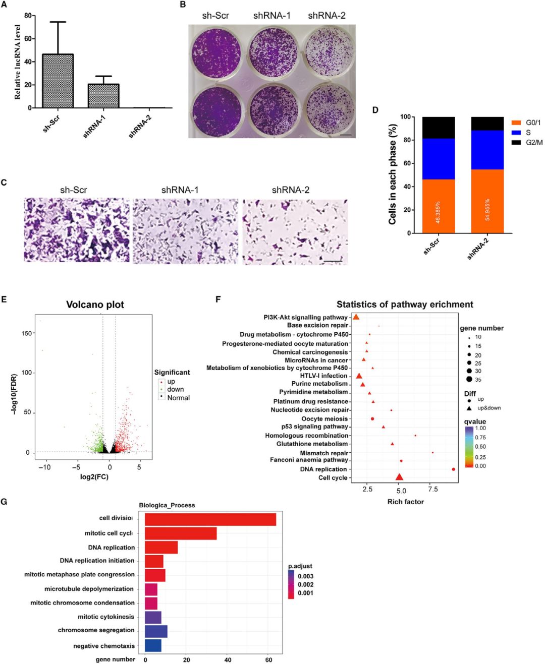 通過設計慢病毒介導的shRNAs來下調(diào)NONMMUT015812的表達,qPCR結果顯示其可使KP細胞中NONMMUT015812的表達減少80%以上(圖A)??寺⌒纬蓪嶒烇@示,NONMMUT015812基因的敲除顯著抑制了KP細胞的生長(圖B)。此外,在Transwell實驗中,穩(wěn)定的NONMMUT015812基因敲除的KP細胞與對照細胞相比遷移明顯減少(圖C)。流式細胞術分析表明,NONMMUT015812基因敲除導致KP細胞明顯阻滯于G0/G1期,G2/M期細胞數(shù)量減少(圖D)。而NONMMUT015812基因敲除對細胞凋亡無明顯影響。