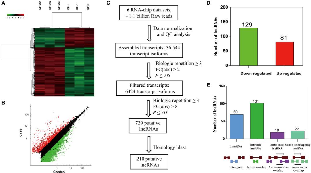 使用芯片技術檢測lncRNA,差異表達lncRNAs的散點圖和聚類圖顯示了肺腺癌和正常肺樣本之間有明顯區(qū)別(圖A、B)。重點研究了在人和鼠之間具有較高差異倍數(shù)且保守的lncRNAs,當FC>8,P<0.05時,鑒定到729個lncRNA。根據(jù)染色體位置保守性和序列保守性,篩選出210個具有潛在人類同源物的lncRNA用于后續(xù)驗證,其中129個上調(diào),81個下調(diào)(圖C、D)。根據(jù)其基因組位置,將210個lncRNA分為u(基因間)、i(內(nèi)含子)、x(反義)和o(正義重疊)四大類。已鑒定的lncRNAs大部分屬于i類,有101個(48.09%)(圖E)。