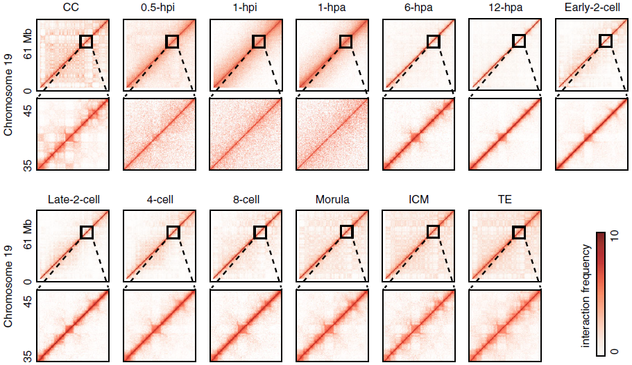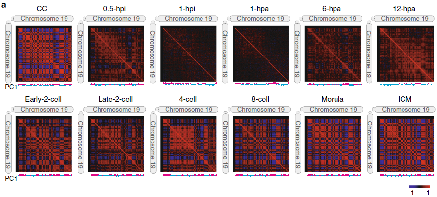 不同時期的胚胎的染色質(zhì)三維構象見下圖,圖中分別展示了分辨率為100kb和40kb時的Hi-C互作矩陣。將CC(Cumulus cell)核注入無核卵母細胞后,染色質(zhì)結構TADs和Compartments迅速溶解,并在6-hpa胚胎中部分恢復。令人驚訝的是,1-hpi和1-hpa單細胞胚胎遠端相互作用明顯較少,并顯示出一致的相互作用模式,這與中期染色質(zhì)組織狀態(tài)高度相似。