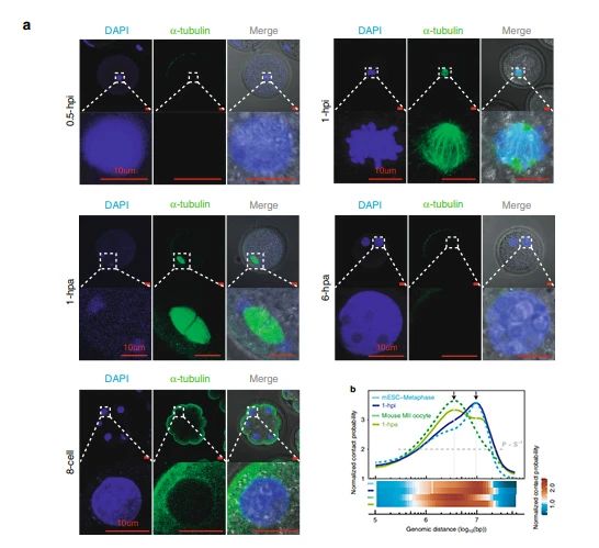免疫熒光染色在1-hpi和1-hpa胚胎中檢測到紡絲裝置凝聚的染色體,這與其他階段胚胎中帶有核膜的間期染色質(zhì)形態(tài)不同(圖2a)。進一步分析表明,1-hpi胚胎的P(s)曲線與小鼠ESC中期相似,在10Mb時迅速下降,而1-hpa胚胎的P(s)曲線與小鼠MII卵母細胞相似,在4Mb時突然下降(圖2b)。這表明當供體細胞在去核卵母細胞中被人工激活1個小時(1-hpa)后,基因組經(jīng)歷了從類有絲分裂中期向類第二次減數(shù)分裂中期的轉變。