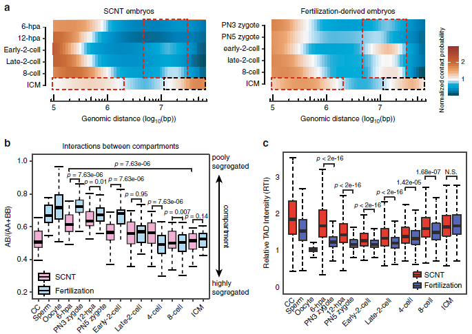 同濟大學生命科學與技術學院高紹榮團隊與江賜忠團隊在Nature Communications雜志發(fā)表了Hi-C互作的相關研究成果。他們采用經(jīng)過優(yōu)化的少量細胞全基因組染色質(zhì)構象捕獲技術(sisHi-C),對小鼠SCNT胚胎發(fā)育過程進行連續(xù)采樣,詳細描繪了SCNT植入前胚胎染色質(zhì)高級結構的動態(tài)變化過程。