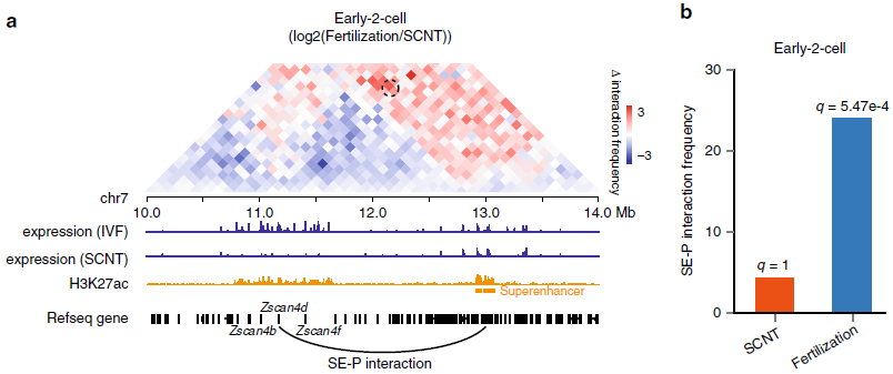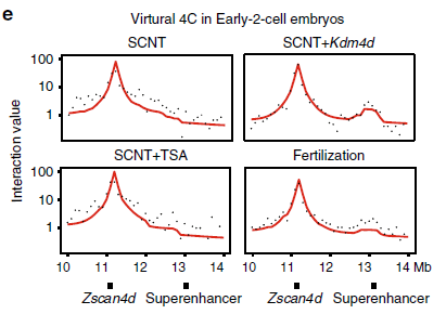 研究表明小鼠SCNT胚胎在合子基因組激活(ZGA)時期有大量的基因未能被正常激活。于是,作者探究了染色質(zhì)空間結構的異常是否會導致增強子與啟動子之間的相互作用無法成功建立。在早2細胞胚胎,發(fā)現(xiàn)關鍵基因Zscan4d的啟動子與上游的超級增強子的SE-P相互作用在受精卵中很明顯,而在SCNT胚胎中則不存(圖5)。
