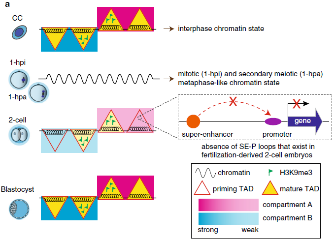 SCNT胚胎發(fā)育6小時(6-hpa)進入擬原核期(對應正常受精胚胎PN3時期)后,出現(xiàn)了較弱的TADs(拓撲相關結構域)信號,并持續(xù)減弱至早期2細胞期,在2細胞晚期到8細胞卵裂期逐步重新建立,直到囊胚期成熟。
