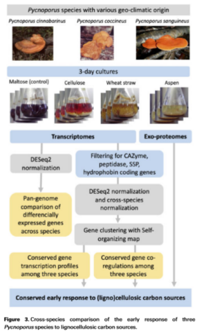 選取四種不同地理分布的擔子菌門/密孔菌屬真菌(P.coccineus、P.sanguineusand、P. puniceus、P.cinnabarinus)研究其在不同類型的纖維素基質下相關酶的代謝情況。通過設置不同碳素培養(yǎng)基:麥芽糖(對照)、秸稈、松木、楊木,模擬對自然界中不同材質的木材的分解能力。探究Pycnoporus屬在基因組、轉錄組、分泌蛋白組層面的共性和差異性,以期找出它們在木質纖維素降解上存在的共性機制。