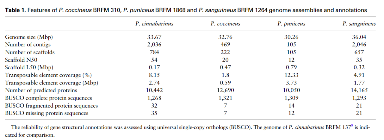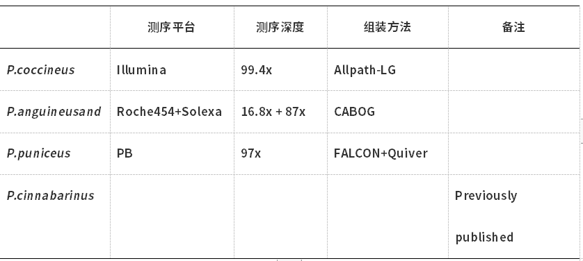 分別對P.coccineus、P.sanguineusandP. puniceusP.cinnabarinus的基因組進行測序和組裝,四種真菌基因組大小差異不大,編碼基因組的數量上也比較接近。