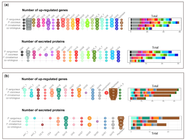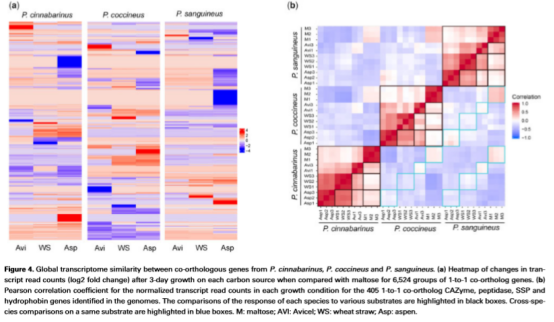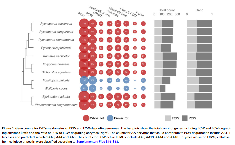 Pycnoporus真菌和其他木材降解真菌中的CAZyme基因含量的進行比較分析。4種Pycnoporus菌中CAZyme基因數量非常相似(平均436個CAZymes,分成108家族),并且和細胞壁降解相關的酶與其他真菌相似。說明在白腐菌中碳水化合物活性酶參與的作用模式比較接近。