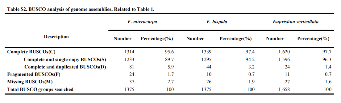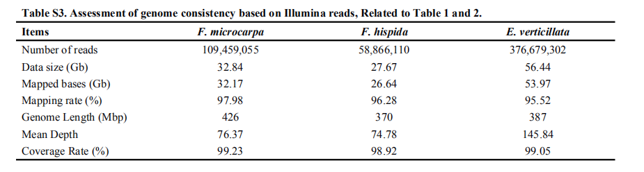 (1)細(xì)葉榕使用~84X PacBio RSⅡ(36.87?Gb)完成426Mb 基因組組裝(預(yù)估436 Mb,97.7%),contigN50=908 Kb, BUSCO評估為95.6%;并通過ALLHiC將423 Mb基因組掛載至13條染色體上。注釋29,416個蛋白編碼基因(BUSCO評估為94.4%)